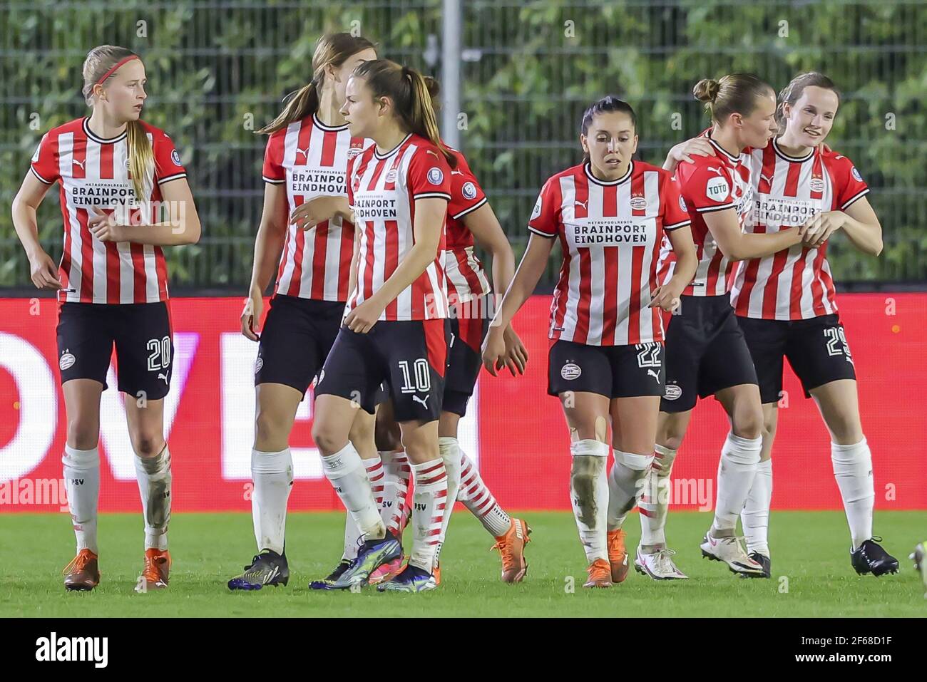 Eindhoven 30 03 2021 De Herdgang Eredivisie Vrouwen Psv Twente Women Season 2020 2021 Psv Players Celebrate 1 0 Goal From Psv Player Esmee Brugts L R Psv Player Julie Biesmans Psv Player
